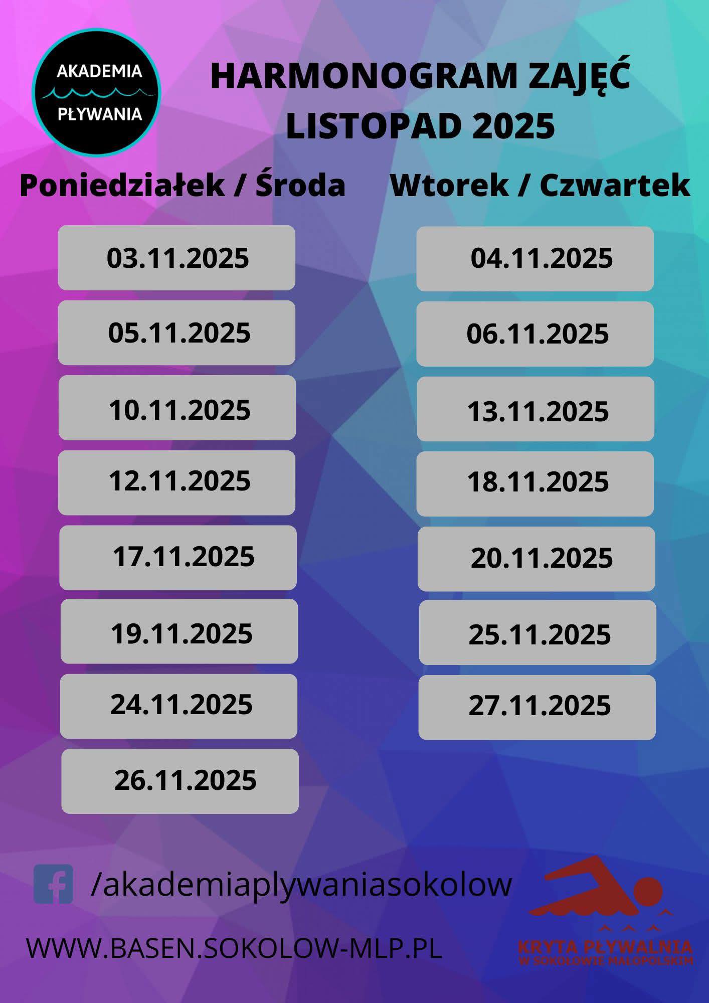Prosimy o zapoznanie się ze szczegółowym harmonogramem zajęć i wytycznymi na stronie www pływalni oraz stronie Facebook Akademia Pływania.